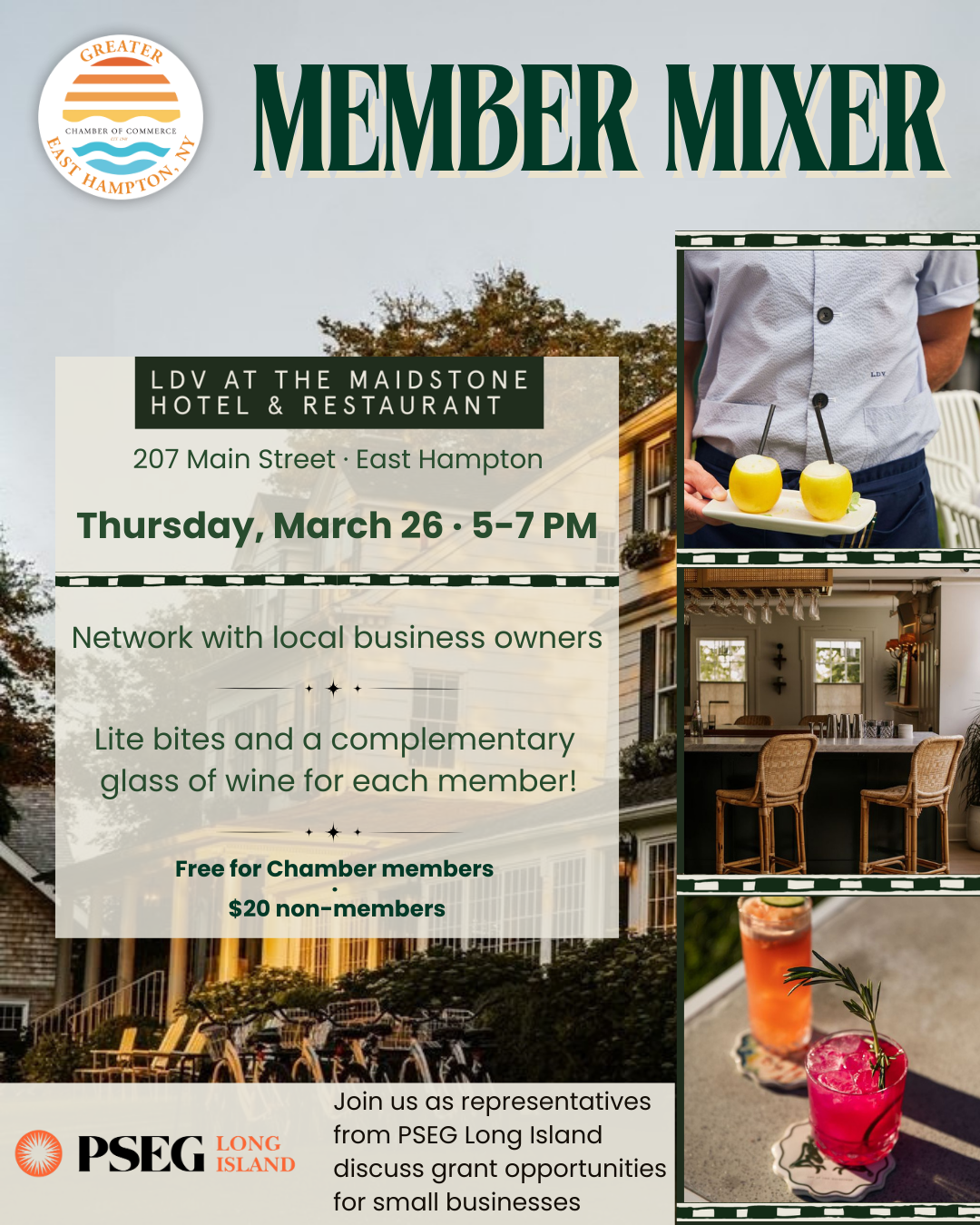 Join us as representatives from PSEG Long Island discuss grant opportunities for small businesses. Network with local business owners and enjoy lite bites and a complementary glass of wine for each member.