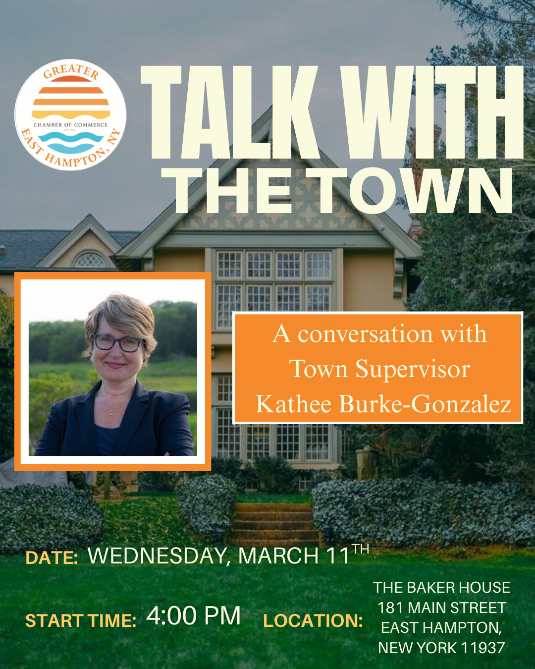 Join us for an insightful Q&A session with Town Supervisor Kathee Burke-Gonzalez. This event offers a unique opportunity to engage with your town supervisor, ask questions, and discuss key issues affecting the East Hampton community.