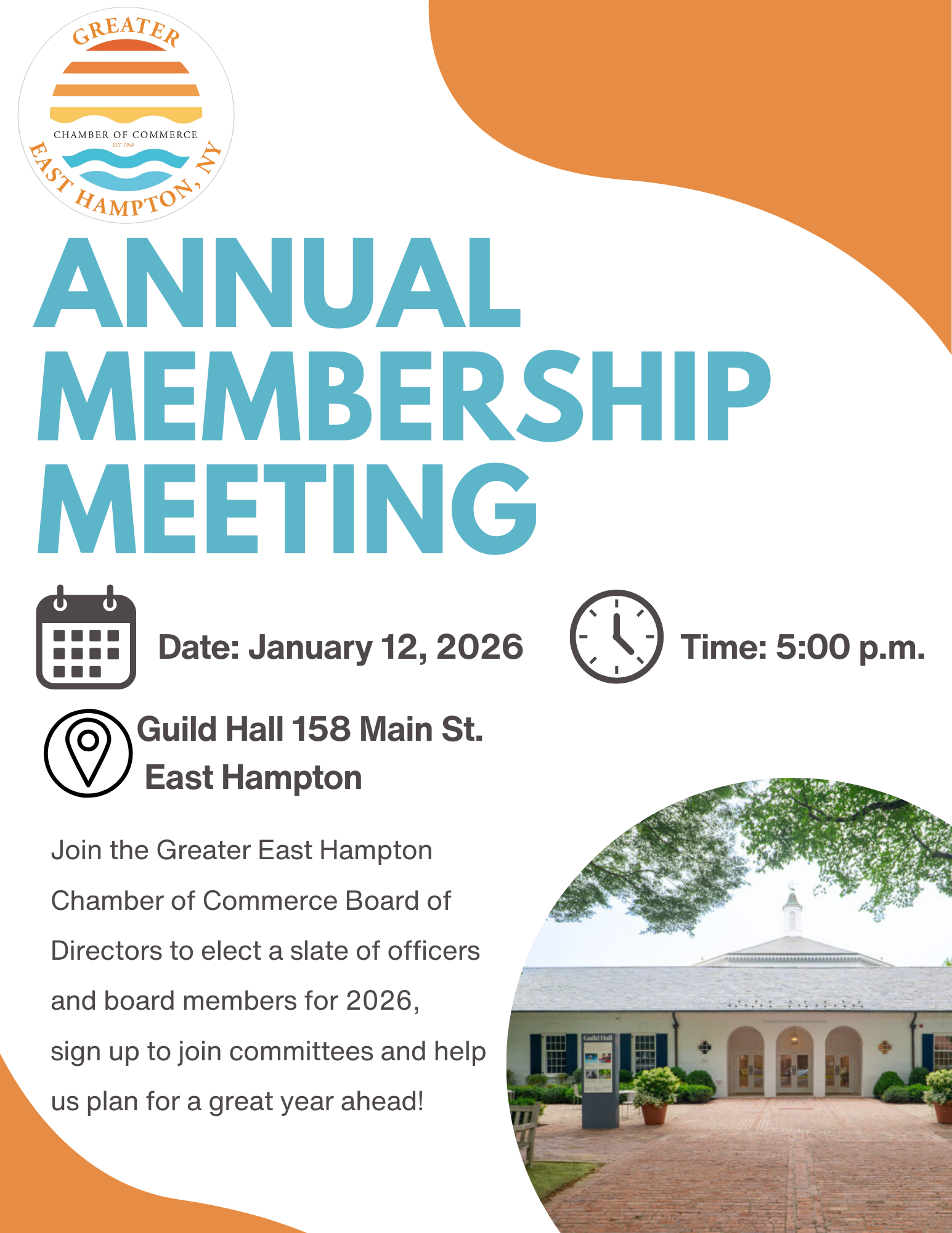 Join the Greater East Hampton Chamber of Commerce Board of Directors to elect a slate of officers and board members for 2026, sign up to join committees and help us plan for a great year ahead!
